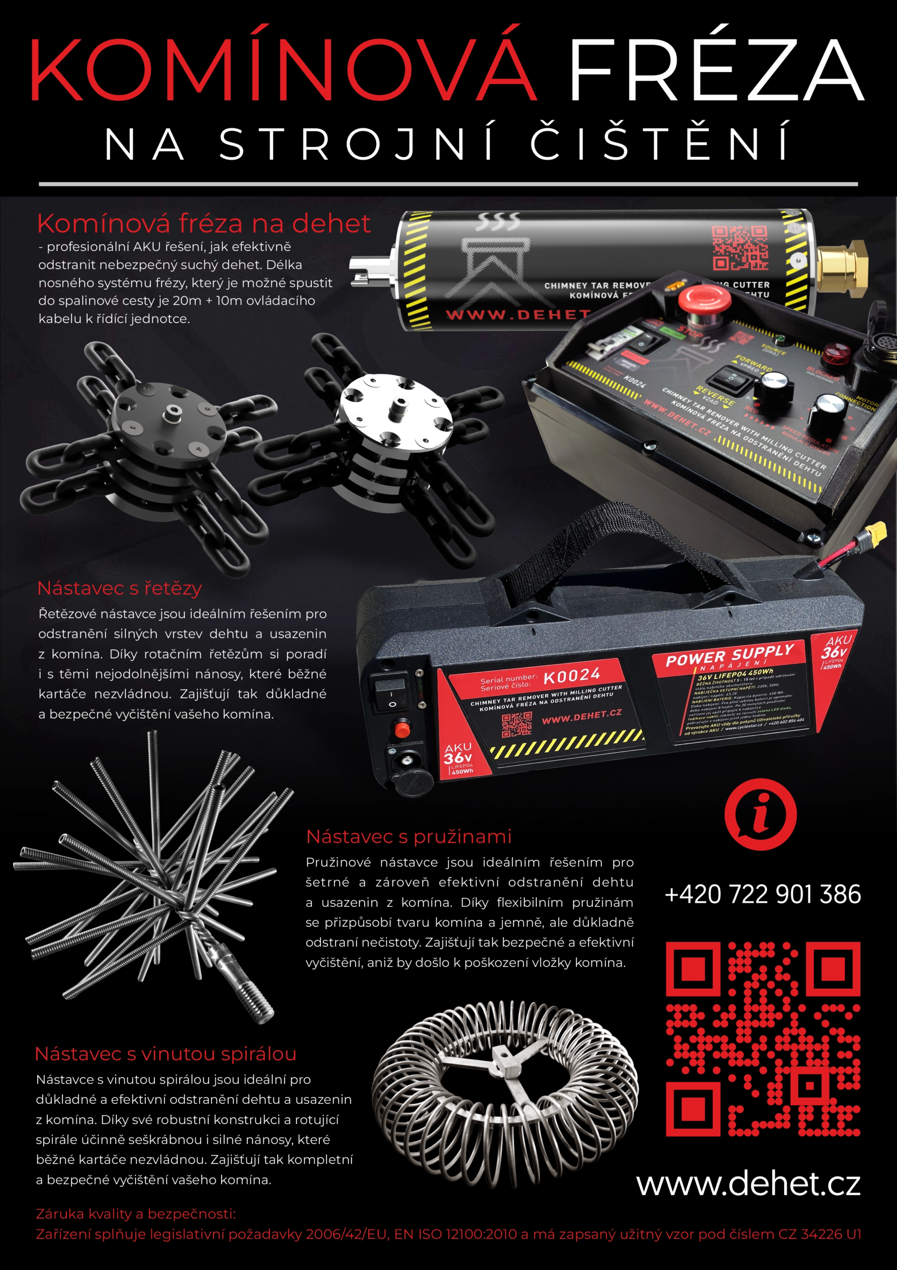 Náš výrobek je řešení pro rychlé a efektivní čištění vašeho zadehtovaného komínu. S naší výkonnou AKU frézou váš kominík zvládne sám provést popisované strojní horizontální čištění. Klasické čištění komínovou frézou vždy provádějí kominíci dva. Odstranění suchého dehtu je tak s naší elektrickou frézou rychlejší a tedy i ve výsledku levnější ve srovnání s dosavadním způsobem čištění pomocí vrtačky. A k čištění spalinové cesty nejsou potřeba žádné střešní ani komínové pomocné konstrukce. Chcete se dozvědět více o tom, jak vám naše fréza může ušetřit čas a peníze?